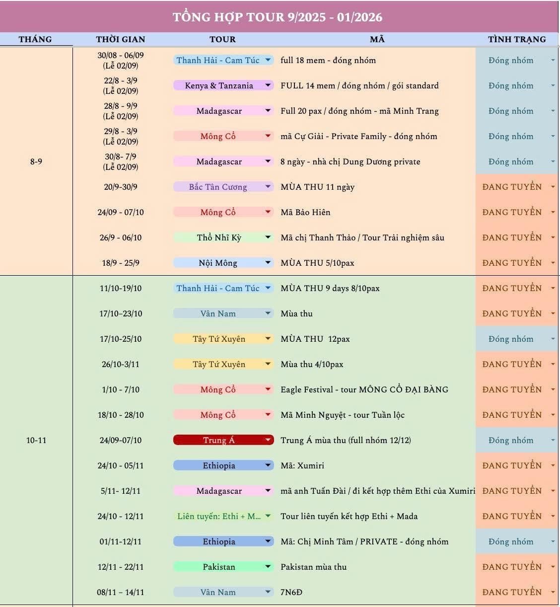 Thời gian khởi hành: từ 09/2025 – 01/2026